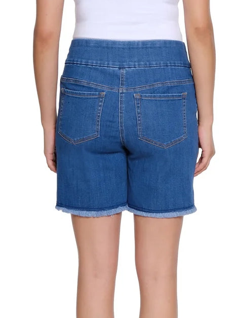 Stretch Denim Short with Fringe Hem