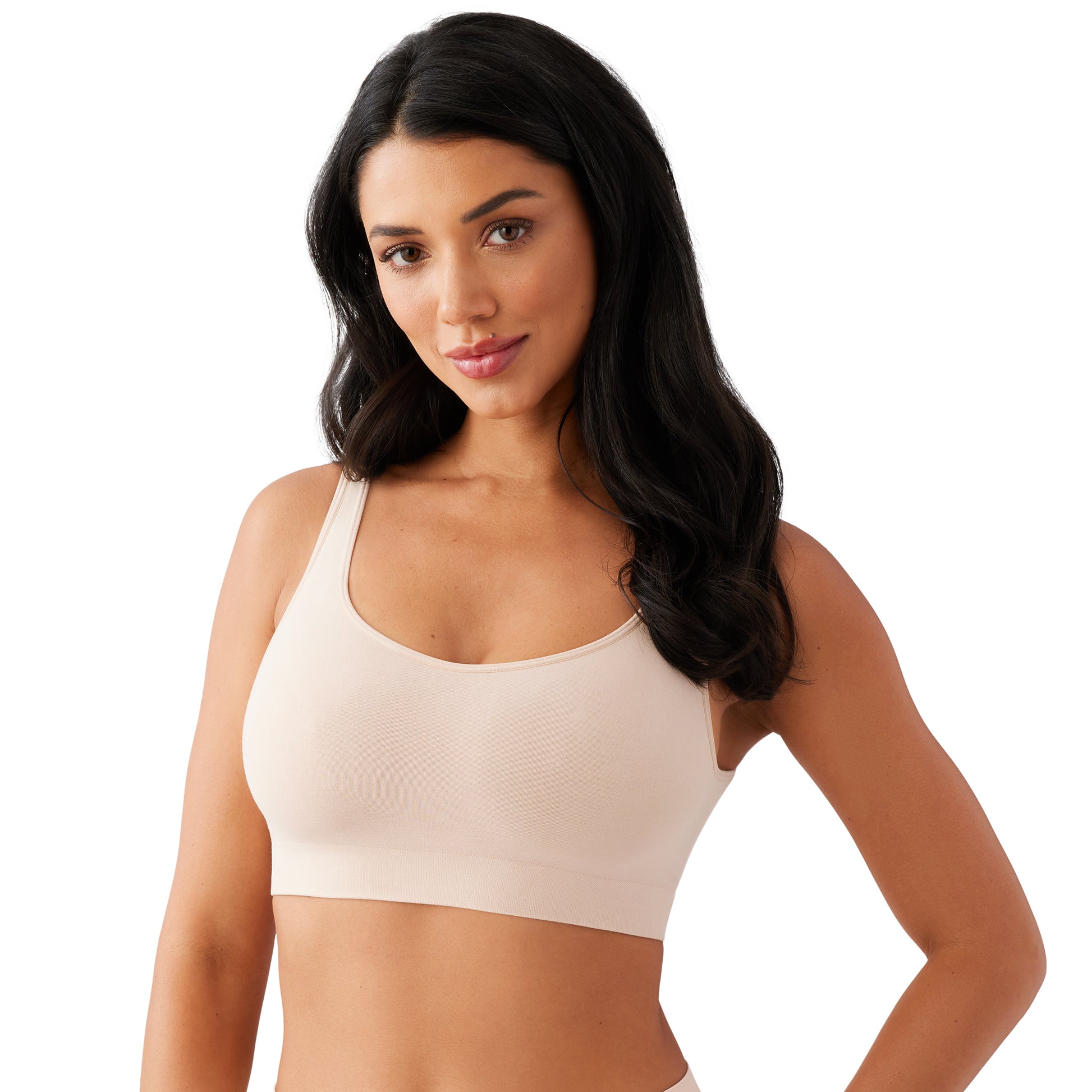 Full busted bralette Full coverage cups designed for D/DD cup capacity. Removable foam pad in cups for opacity and shaping. Hook-and-eye back closure. Lightweight, super soft, four-way stretch fabric for all-day comfor.t Soft, wide bottom band for comfort and a secure fit. V-shape back Wide, hardware-free straps.
