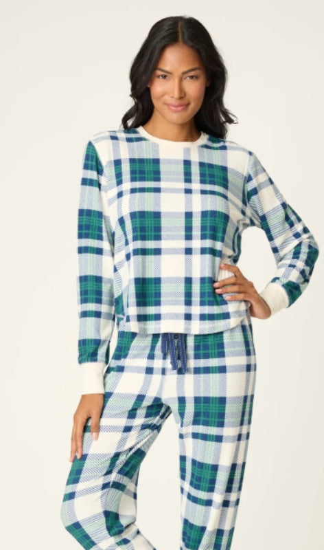 - Mad for plaid? Us too. This dreamy topis crafted from cloud-soft thermal velour in classic blue-and-green checks on an ivory backdrop.